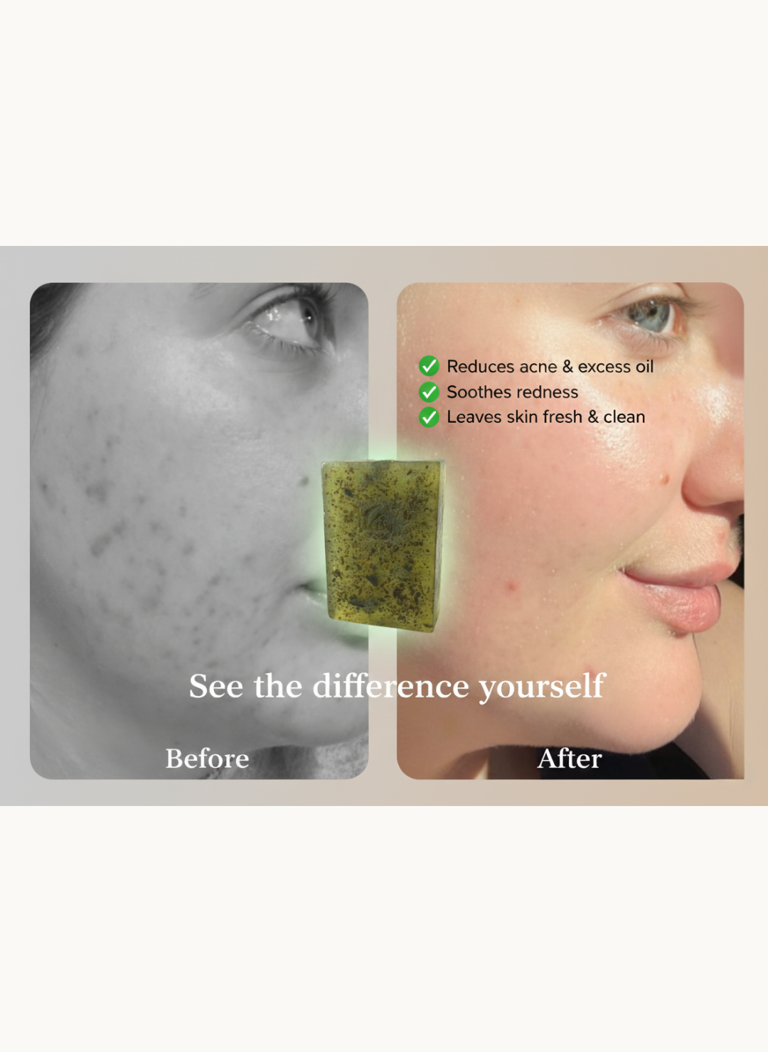 This natural soap is specially formulated to gently cleanse, fight acne-causing bacteria, and soothe irritated skin without harsh chemicals. Perfect for oily and acne-prone skin.